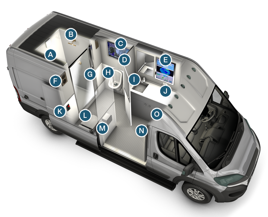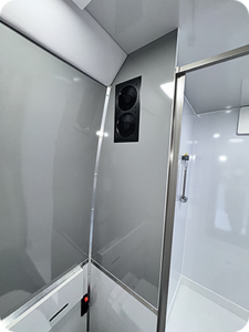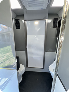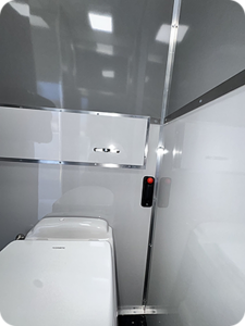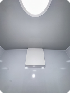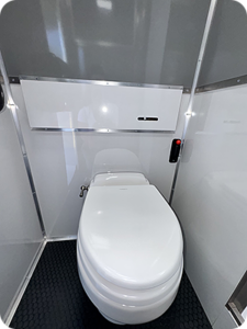 Full-size smart commode offering a lighted, spacious, and hygienic bathroom facility for extended use.