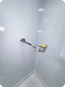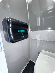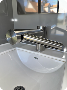 Integrated touchless wash and air-dry station — fully self-contained with no paper towels needed.