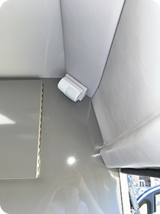 Ceiling-mounted carbon monoxide and air quality sensor providing continuous environmental monitoring for occupant safety.