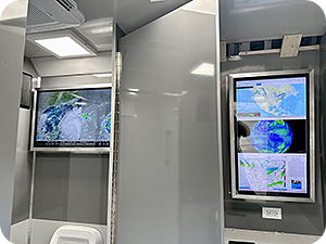 Large wall-mounted display screen for situational awareness, briefings, navigation, and operational monitoring.